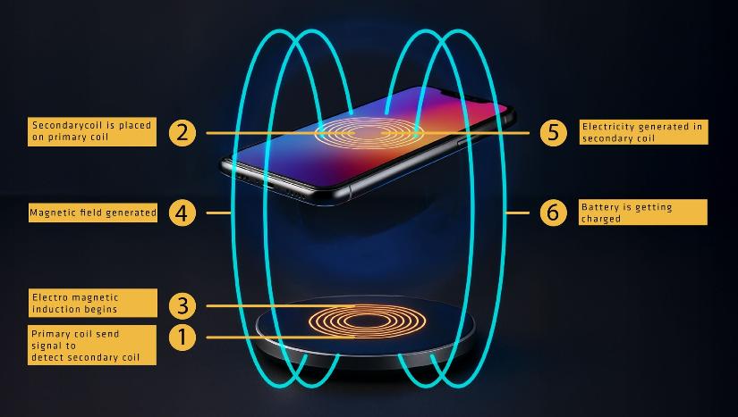 充電パッドの内部には電磁場を発生させるコイルがあり、デバイス側にはそれを受け取って電流に変換し、バッテリーを充電する受信コイルが搭載されています。